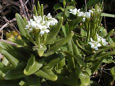 4〜6月咲 白い4弁の花 白さが目立つ花 画像は少し拡大している 種の莢が変に長い 長い花穂もあるが海岸は乾燥して いるので旗竿には程短い 葉は多肉質で厚く、表面は舌のよ うにザラザラしている 日当たりの良い海岸に生える 草丈30cmまで