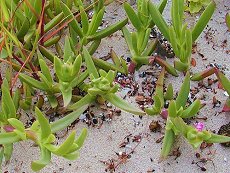 4〜5月咲 星型の小さなピンクの花 白もあるらしい 葉は多肉質で、砂の中に生えた 松葉菊のようだ 写真は実物大 葉の脇からピンクの蕾が出ていた が開いていなかった 海岸の砂地に生える 草丈15cmまで 南から海流に乗ってきたのだろう 山口県の海岸に生えていた