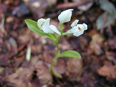 5〜6月咲 白い花を数個茎の先端に咲かせる 花の中に赤い色がある 花径1cm程度 山の林床に生える 森の中の腐葉土の中にひっそりと 生えていた 草丈30cmまで
