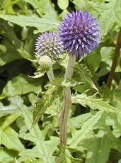 7〜9月咲 青藍色の丸い花 花径5cm程度 花形が面白い 稀に日当たりの良い山野に生える 直立した長い花茎を出し先端に花 を咲かせる 茎や葉裏は白色 葉にはトゲがある 草丈は1m程度 株張りも良い