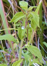 9〜10月咲 花は葉の付け根に少数咲く 花色は薄青紫 花径3mm程度 茎には毛が多く見られる 葉は対生し柄があり鋸葉になる 日当たりの良い山地や丘陵地に生 える 草丈は30cm以下 似ていて草丈が高く茎に毛が少な く花つきが多いひめじそ