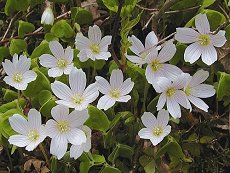 深山の半日陰地に生える 白い5弁の花で径2〜3cm程度 みやまかたばみより花も葉も小型 花色は少しピンクがかる 花に紫色の筋が入る 花は上向きに咲く ピンクの花もある 5〜8月に咲く 桜を思わす花形だ 草丈10cm以下