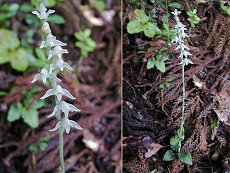 少し赤味がかった白い花 花は7個から12個くらい咲く 花は鳥が翼を拡げたような形をし ている 7〜9月に、やや乾いた山地の林床 に咲く常緑の多年草 茎は地を這って花茎を立てる 葉には白い網班がある 花を入れて草丈25cm以下 花径1cm程度 葉にある模様でウズラと呼ばれる