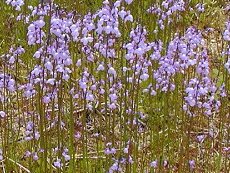花は4〜6月に咲く 薄い青紫花で花径1cm程度 日当たりの良い道路沿いや荒地に 群生する 葉や茎が細く直立して花だけが目 立つ 地面が青色になるようで美しい 草丈30cmまで 日本の海岸には黄色の花のウンラ ンがある 栽培種には姫金魚草(リナリア) があり花が似ている