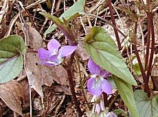 3〜4月咲きで早めに咲く 山地から丘陵にかけて生える 花色は薄めの紫で花径2cm程度 根元の葉はハート型だが先にいく ほど長葉となる 花茎も長く立ち上がる 葉の付根の托葉が尖り目立つ 草丈30cmまで たちつぼすみれ おおばたちつぼすみれ