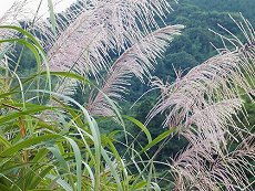 7〜8月に咲く 穂は大型 長さ40cm前後 日当たりの良い野原に生える 風になびく様は優雅である 冬に葉が枯れないのでトキワスス キの名前がある 草丈2.5m以下でよく株が茂る 生えていると荒地の感がある