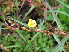 8〜11月に咲くつる性の1年草 黄色で4弁の花 花径15〜20mm程度 茎は翼状で角ばる 葉は細長く長さ4〜10cm程度 柄が無く茎に直接つく 水辺や田に生える ミズキンバイは沼や池の中に生え る黄色の花 タゴボウは水田に生えるチョウジ タデの事で黄色の小さな花が咲く