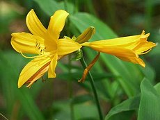 7〜8月咲き 黄色の6弁の花で径7cm程度 日当たりの良い山地の草原に生え る 高原に集団で咲くと見事 葉は2列になり細長く先端が垂れ る 花は茎の先端に4個までつける 草丈80cmまで 仲間には北海道にエゾゼンテイカ がある 同属のゆうすげ やぶかんぞう のかんぞう
