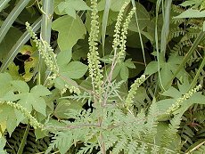 8〜9月開花 風媒花 日当たりの良い荒地に生える 花は黄緑色の穂状 花の長さ10cm程度で上が雄花 雌花は下の葉脇に数個つく まるで稲科の花みたいで冴えない 葉が細く割れる 葉は柔らかく上部では互生する 大豚草と共に花粉症の原因とされ ている 草丈は1.5mまで