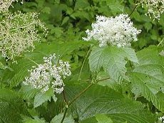 6〜8月白い小花を房状に咲かせる 淡い紅色を帯びるのもある 花の径5〜7mm程度 花弁は5枚 花全体の径は10cm前後 深山の湿気のある沢沿いに生える 多雪地帯を好む 葉は大きくて手状になる 木苺の葉を思わせる 草丈2m以下 同科にはやまぶきしょうまがある