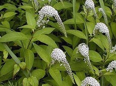 6〜7月咲き 林の縁や道端に咲く 白い花は涼しげで群がって咲く 花先が垂れ下がり虎の尾に似てい る ひとつひとつの花は桜草科の特徴 がある 草丈60cm位 同属に花色が黄色のくされだまが ある