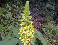 7〜10月咲き 花が下から徐々に咲きあがる 林間の湿地に生える 葉はふきに似ている 花の濃い黄色は目立つ 草丈1〜2mまで 似た花でメタカラコウがあるが花 弁(舌状花)が3枚くらいで少ない 又草丈が1mまでで小型