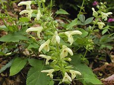 8〜9月咲き 林間や山道沿いに生える 花の長さ3cmまで 薄い黄色で桐の花に似ている 半日かげで、初秋のひざしの中柔 らかに咲き美しい 山菜で春に若い芽をゆでてゴマあ えや油いためにする 草丈60cmまで 別種に紫色のあきぎりがある