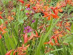 みともり 私の花図鑑 クロコスミア又はモントブレチア (ひめひおうぎすいせん,姫檜扇水仙) 戻 る 【あやめ科モントブレチア属 】 原産地 交配種