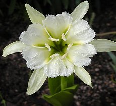花色は白や黄色 花径8cm程度 6〜8月に咲く 4月に植える球根は頭が見える程度に植える 熱帯植物なので枯れたら掘りあげ、 乾燥させて暖かい場所で保存 草丈は80cmまで 種間交雑されて花形の多彩な花が ある 利用方法:花壇、鉢植え用 花言葉:貴方を見つめています
