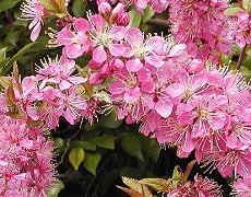 秋又は冬に植える ゆすら梅に似ているがこちらは鑑賞 用 3、4月に咲く ピンクの花で庭は華やかになる 花は2〜3cm大の1重で枝いっぱいに 花をつける 梅雨前に赤い実をつけ、赤黒く熟す と食べられる 樹高 2mまでの落葉低木 樹性は強健で株立ち 種で繁殖する 利用方法: 庭木、切花