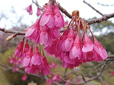 1〜3月ごろ花径2cm大の紅色の花を咲 かせる 花は半開で終わる 下向きに咲く 春早く咲く桜で木全体が紅赤色になり 華やか 7m以下の中木 用途:公園や街路樹、庭木 花言葉:
