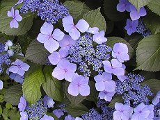 6〜7月開花 中央の両性花と回りに装飾花を咲か せる 栽培種なので色が鮮明で美しい 挿し木でも良く増え栽培しやすい 植え場所は腐植土の多い半日陰に 樹高2mまで 株立ちの落葉樹 用途:庭木、鉢植え、花材 花言葉:
