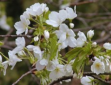3月下旬〜4月始めソメイヨシンと同 時に白い大きめの花を咲かせる 花径は30〜40mm 葉も花と同時に開く 葉の縁には尖った鋸歯がある 葉を桜餅に使う 樹高10mまでの落葉高木 用途:公園樹に利用