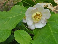 5〜7月咲 中央が黄色で花弁が白い花を咲かせ る(花径6cm位) 花弁の先は少しピンクがかる 半八重 耐寒性あり 日当たりの良い肥沃地へ植える 葉は長い楕円形で対生し大きく光沢 があり縁は少し波打つ 3〜4月に植える 樹高3mまで 利用:庭木