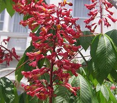 5月咲 花穂の長さ20cm程度で大きい 花色は文字通り赤い 耐寒性あり 日当たりの良い肥沃地へ植える 小葉は5〜7枚ある 繁殖は種蒔きか接木 移植は真冬を除き落葉した時 芽が動かない内に植える 樹高6mまで 似た花で西洋栃の木と、この木の交 配種の紅花栃の木があり花色が薄く 樹高が15mになる 利用:庭木