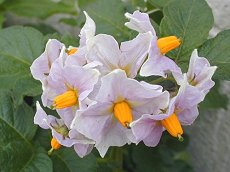 春、秋に咲く 春は4月の終わりから5月に咲く 年2回植え付けられる 花色は白から藤紫まで 北海道のじゃがいも畠の開花はすば らしい 開花は7月 見渡す限り白い花で満たされ、あた り一面良い香がする 日に当てた緑色の芋には一種の毒が 発生して食べられない 新芽にも毒があるので注意する 利用: 食用