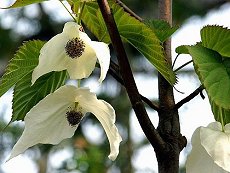 5〜6月咲 大きな白い花が垂れ下がる 花径20cmまで 葉は互生する 葉の長さ15cmまで 花びらに見えるのは苞 柄があり、元部は心型で先端は尖り 鋸歯 樹高20mまで 珍しい木で発見者の名前がついてい る 1属1種 利用:庭木、公園樹