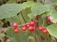 花は6月に薄紫の小花を咲かせる 9〜10月に赤い実を沢山つける 実の大きさ5mmくらい 樹全体に赤い実をつけ賑やか 山の湿地に生えている 葉の形が梅の葉に似る まとまりの良い樹形で庭木によく 利用する 実を鑑賞する 落葉小低木で樹高3mまで 比較的に寒地にも適応する 用途: 庭園樹に利用