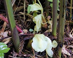 8〜10月地面からたけのこ状で緑の花 芽(長さ5cmまで)を出し、先に薄黄 色の花を咲かせる 花径4cm大 花の咲き出さない若い花芽を食べる 春の新芽も食べられる 日当たり地から半日陰まで栽培できる 強健で野草のようだ 葉はしょうがやジンジャーに似ている 用途:薬味や漬物、酢の物に利用
