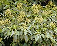 5〜6月頃開花 ライトグリーンの花 集合花全体は10cm位 星型の実も面白い 葉は先細りの楕円形でつやがある 山地の川沿いに生える 高さ20mまでの常緑高木 属1種の木 樹皮を鳥もちの材料にする 別種のもちの木を見る