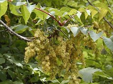 5、6月頃開花 ライトグリーンの垂れる粟粒状の 房花 集合花全体は12cm位 葉は秋早くから紅葉する 山地に生え、似た木では海岸地方 に同科のハゼの木がある 高さ8mまでの落葉中木 雌雄異株 子供のころ良く山でハゼにかぶれ ていたが、今でもうるし科には悩 ませられる