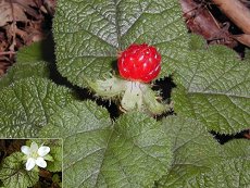 5〜7月頃開花 7〜8月実が赤くなる 白い花、黒い縁取りのある若葉と もに美しい 名は冬苺だが実際は夏苺 実は小さいがたべられる 花のがく片(花を包んでいるもの )が大きい 山地の木の下や藪の中などに生 える つる性常緑小低木 似ている冬に実が熟す冬苺 用途:影地のグランドカバーによ さそう