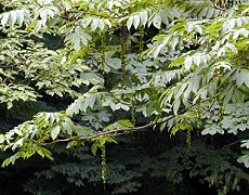 5月頃開花 30cmまでの細長い紐のような花を 咲かせる 花や実も、遅くまで形が残り見つ けやすい 実も翼をもって小さく、鬼胡桃のよ うには食べられない すこし高地の沢ぞいに生える 葉は複葉で大きいが鬼胡桃より小 型 高さ30mまでの落葉高木 雌雄異株 利用:公園樹、器具用