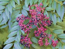 花は7〜8月に咲く 薄緑の小集団花 雌雄異株 9〜10月に光沢のある黒い実を、 枝先につける 山椒のようには葉が香らず食用に はならないので犬がついている 小葉と刺は山椒のようには対生せ ず互生(たがいちがい)する 落葉低木で3mまで 山鳩などがこの実を食べる アゲハチョウ類もこの葉を食べる 利用:葉をつぶし打撲傷に使用