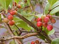 4〜5月頃薄黄色の集団花を咲かせる 日当たりの良い山地に生え木等に巻きつく 雄花と雌花があるがわかりにくい 雌雄異株 ゆり科に似合わない地味な花だ 葉は水々しい光沢のある緑色で大きいものは15cm位の円形になる 枝には鋭いトゲがありサルも近寄らない? 柏餅の葉の代用にする 秋には1〜2cm大の赤い実が鈴生りとなり美しい つる性落葉木