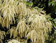 5〜6月頃枝先に紐型でクリーム色 の集団花を咲かせる 花は長さ10cm位 垂れ下がるのが雄花 雌花は立ち上がる 栗より早めに咲く 暖地の森では普通に生えている 実は小さいが食べられる 常緑高木で25m 用途:庭木、街路樹、建築材