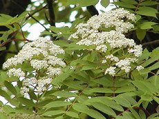 6〜7月頃小さくて白い5弁花を集 団で咲かせる 秋の実と紅葉は美しく高山の代表 的な落葉広葉樹だ 涼しく日当たりの良い高地に生え る 葉の軸が赤い 樹高は15mまでだが小木で枝を拡 げ潅木が多い 名前は七回かまどで燃やしても燃 え尽きないほど燃えにくい木から 主に実と紅葉を観賞する 用途:寒地の庭木や街路樹