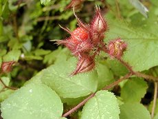6〜7月に薄い紅花の小花を咲かせ る 尖る萼(がく)片に特徴あり 日当たりの良い山に生える 葉や枝全体に赤い刺がありこの茂 みは難物だ 小さい実は食べられる 樹高2mまでの半つる性の落葉低木 用途:猫や動物よけに まれには 人よけに