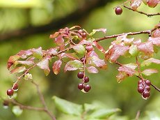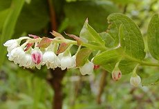 5〜6月ごろ緑色や赤色まじりの白 っぽい花を列状に咲かせる 釣鐘状で丸く花径6ミリ程度 葉のふちには毛がありすのきのよ うには食べられない 葉は赤みをさす事が多い 日当たりの良い乾燥気味の山野に 生える 樹高2m以下の落葉小木でよく茂り 地面を這い枝を張る 秋には実が黒く熟し食べられる 似ていて花が白いほながなつはぜ 用途:庭木