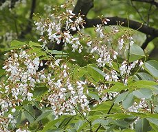 6月ごろ白の穂状の花を咲かせる 萼(がく)は赤みを帯びる 花はマメの蝶型 花径1cm程度 葉は奇数の羽状複葉で互生する 山地の谷筋に生え個体数は少ない 3年に1回くらいの開花 樹高20m以下の落葉高木でよく茂 る ろくろ材に利用される 用途:庭木、建築、器具材