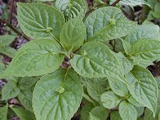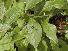5〜6月ごろ葉の中央に黄緑の小 花を咲かせる 山地の林間に生える 雄雌異株で雌株に黒い実が1個か ら3個成る 花や実が出来た葉を筏に見立てた 樹高2m以下の落葉低木 用途:生花、庭木 下は実の写真