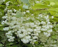 5〜6月頃谷あいに、藤の花に似た 白い花房を垂れる 花の大きさは1cm位 フリルがあるので岩鏡に似ている 木ぶりに似合わず清楚で美しい花 葉は楕円形 成長が早く辺材が白く柔らかいの でマッチの軸や器具に使用 15mになる落葉高木 同属の花の似ているあさがら
