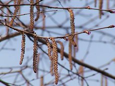 3〜4月に長さ4〜6cmの細長い紐 状の雄花を下げる 雌花は小さな楕円形の先に赤く放 射状に開き、雄花の上に別に咲く 葉は互生し広い楕円形 小さな鋸歯がある 実は角状の突起があり食べられる 少し高地の日当たりの良い山に生 える 幹は灰白で小さな斑点がある 樹高5mまでの落葉低木