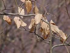 4月ごろ新芽が伸びるまで、枯れ 葉を枝につけている 4〜5月に緑色の小花を咲かせる 花は個性がないが枯れ葉が個性 を主張している アウトサイダーな木だ 日当たりの良い山に生える 雄雌異株 実は7mm大の円形で秋に黒く熟す 葉の長さ5cm程度の楕円形で先尖り 幹は灰褐色で平滑 樹高5mまでの落葉低木
