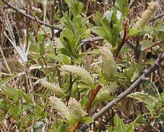 4〜5月に猫柳に似た黄色の雄花 とこの写真の雌花を咲かせる 高山の早春に木の枝先が花で黄 色になると美しい 乾いた山地や丘陵に生える 柳は湿地だけでなく尾根にも生え る 樹高10mまでの落葉低木 葉は光沢があり革質 用途:生花、護岸、薪炭、器具用
