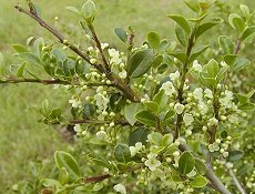 6〜7月ごろ白い4弁の小花を咲か せる 高めの山地に生える 湿地にも生える 地面を這うように茂る 白い花なのであまり目につかない 雄雌異株でこの花は雄花 常緑低木で樹高1.5mまで 冬には黒い実がなる 犬ツゲは普通の山地に生え樹高が 高くなる 枝はもっと伸びる