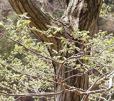4〜5月雄花は黄緑の穂を2個ぶら 下げる 花長6cm程度 雌花は苞鱗(花芽を包んでいるも の)に各一個つく 幹は灰白色で平滑、浅い割れ目が 黒く幹をうねるように縦に入る 幹の白黒の対比した木肌が特徴的 だ 山地に生える 落葉高木で樹高20mまで 用途:建築材、器具材、薪炭、キ ノコ用