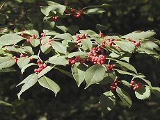 花は6月に薄紫の小花を咲かせる 9〜10月に赤い実を沢山つける 実の大きさ5mm位 樹全体に赤い実をつけ賑やか 山の湿地に生えている 葉の形が梅の葉に似る まとまりの良い樹形で庭木によく 利用する 実を鑑賞する 落葉小低木で樹高3mまで 比較的に寒地にも適応する 用途:庭園樹に利用
