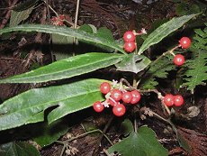 7月に白い花を数個まとまって下 向きに咲かせる 花は5裂する 暖かい山地の林内に生える 葉は厚く長楕円形で表は光沢が ある 長さ12cm程度 縁は平滑 冬、葉の上に円形の赤い実をつ ける 径7mm程度 樹高40cm以下 名前は中国から来た橘の意味 別名は百両 千両を見る 万両を見る 十両を見る 用途:庭木、鉢植え、生花に利用