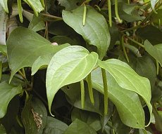 4〜6月に7cm程度の紐状の花を垂 らす 雄雌異株 球形の果実は冬に赤く熟す 葉は互生する 暖地海岸近くの林内に生える 幹の節から根を出し岩や木にから む 用途: